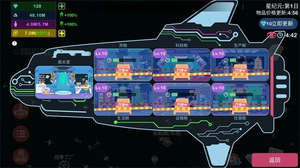 2、其次要注意主舰必须升级,别因为运输不足就只升级货仓和运输仓(其实到了后期我的运输仓基本都是空的,原因之前提过——我不囤积那些货物,所以不用在各个星系之间来回运输,通常只需运输市场所需的物资就行)。我认为生产仓和科技仓是最重要的!生产仓决定了你能否在市场上生产那些利润高的商品,科技仓不足的话,任务不好完成,材料也难以获取。比如我刚开始没升级生活仓和住宿仓,导致等级跟不上,后来花了不少钻石才追赶上进度(这是为了满足我的强迫症)。