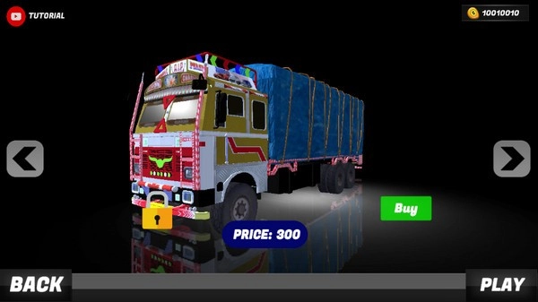 3、接下来就能挑选卡车了,向右滑动屏幕就能找到这辆外形神似擎天柱的卡车,不愧是印度老表,连这个都能做出来,点击PLAY开始吧