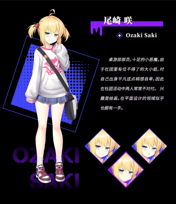 桌游部的成员,是个十足的小恶魔。因为社团里有位很厉害的大小姐,她对自己出身平凡这件事有点自卑,所以在社团活动时两人经常合不来。她的兴趣是绘画,在平面设计方面好像也挺有本事的。
