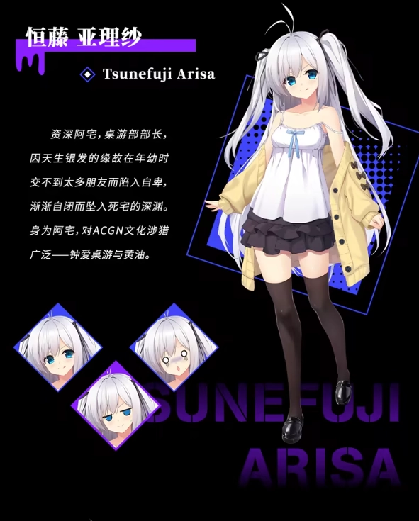 这位资深阿宅是桌游部的部长,因为天生银发,小时候没交到多少朋友,慢慢变得自卑,甚至有些自闭,最终彻底成了死宅。作为阿宅,他对ACGN文化了解得很全面,尤其喜欢桌游和黄油。