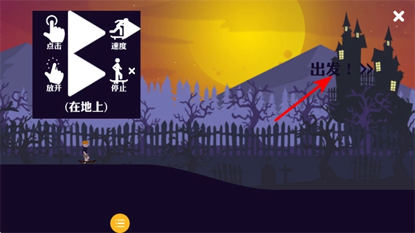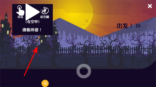 1、在游戏里,点击出发按钮即可开启滑板环游之旅,这是进入游戏挑战的核心操作,能操控角色在万圣节场景中开启冒险。