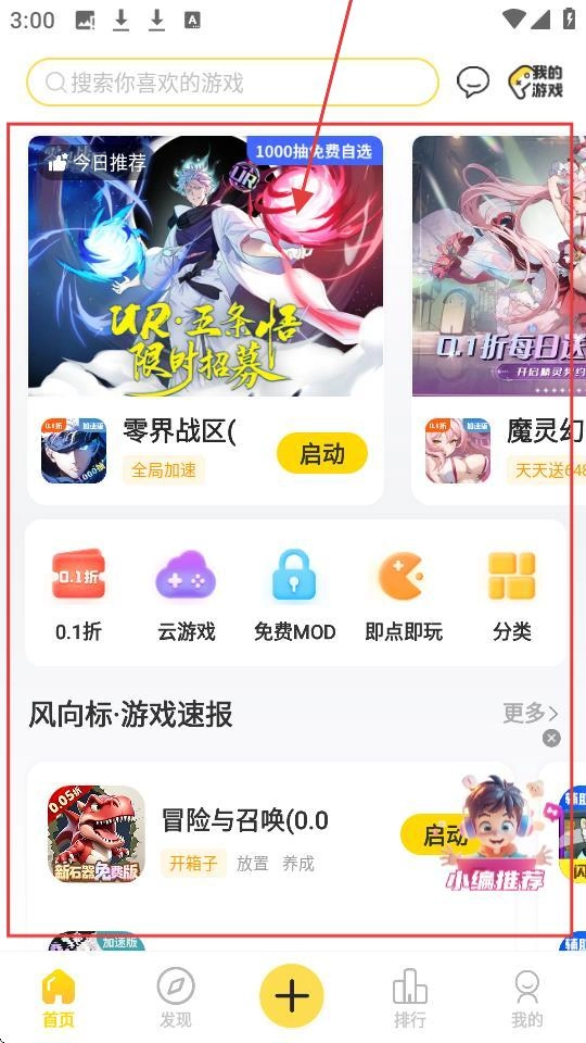 1、我们进入软件,看到推荐的《零界战区》等游戏,若对某款游戏感兴趣,点击游戏区域,即可进入游戏详情页啦。
