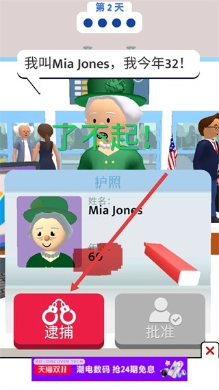 4、点击红色的逮捕按钮,对使用假护照的旅客采取处置措施。