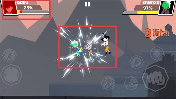 2、操控【GOSU】对战【ZANAXU】,触发【2-Hits!】连击,此时【GOSU】血量为【15%】需注意规避伤害。