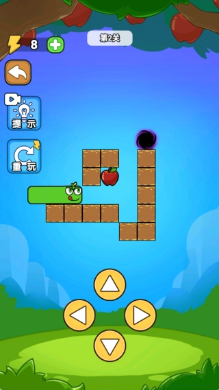 2、自由控制小蛇移动,玩家要让小蛇能吃掉苹果,顺利到达目的地就能解锁新的关卡。