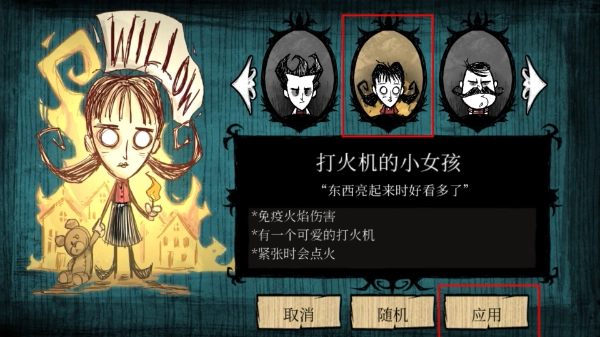 3、选择【打火机的小女孩】角色后,点击界面底部的【应用】按钮,确认角色选择,为进入游戏做准备。