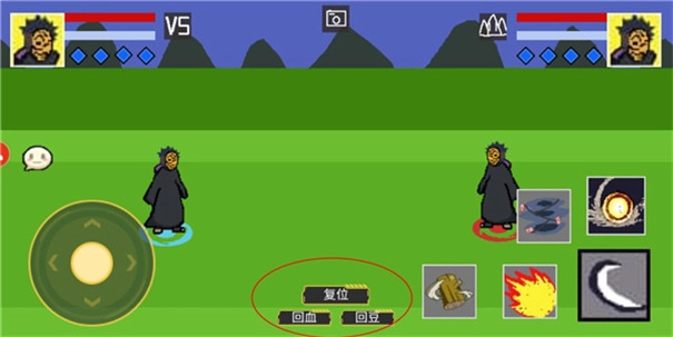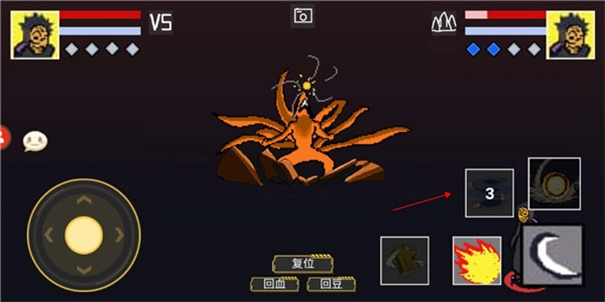 接下来,玩家能够为自己和AI对手分别选定角色、忍术卷轴以及通灵兽;若想随机搭配,点击界面上的问号按钮即可;所有选项确认无误后,点击开始按钮就能进入游戏环节。
