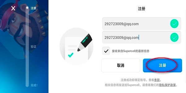填写电子邮箱,比如可以用QQ邮箱来操作,记得选中同意接收Supercell最新资讯的选项,最后点一下注册按钮就好。