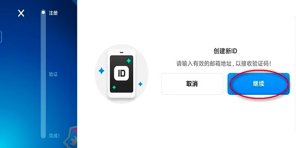 用邮箱地址创建新ID,点击“继续”。