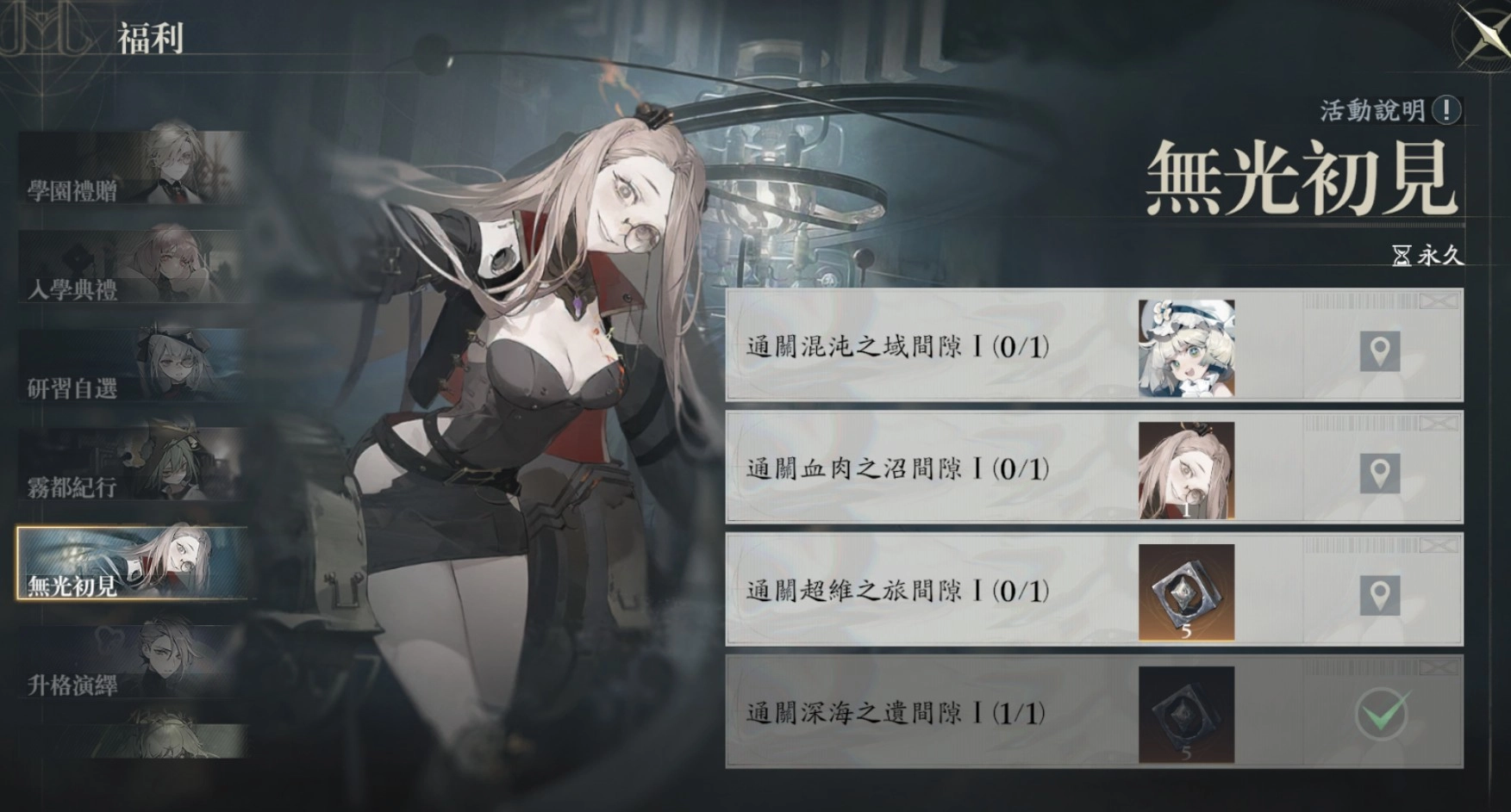 首次通关无光之境时,能在福利界面领取10次抽奖机会与2个SSR角色的丰厚奖励。该活动为永久开放,即便开服初期因练度不足暂时无法通关,也无需担忧。