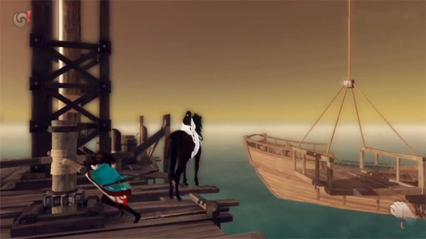 要把小璃和马送到不靠近岸边的小船上,得先骑马登上那个木台,这样就能触发对应的动画了。