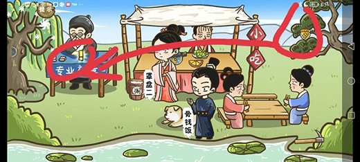 第二个步骤:点击摊位上的碗具,它们会自动堆叠起来,接着将油罐的盖子拖拽至碗具上方。