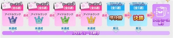 WING比赛的难度相较于之前的试镜都要高,并且只有获得第一名的选手才能晋级。只有当队伍搭配得十分完善、头四轮的偶像育成工作做得好,同时在决赛时具备一定的运气——比如流行的属性恰好是自己主力培育的方向,才有较大的获胜机会。获胜之后,就能解锁相应的剧情,同时完成这次偶像培育的任务。