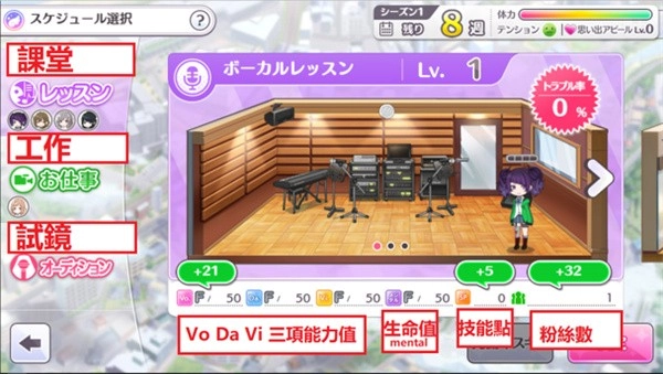 在试镜和休息之外的所有活动都会消耗体力值,体力值处于较低水平时,参与课程学习和完成工作任务的失败概率会相应上升。