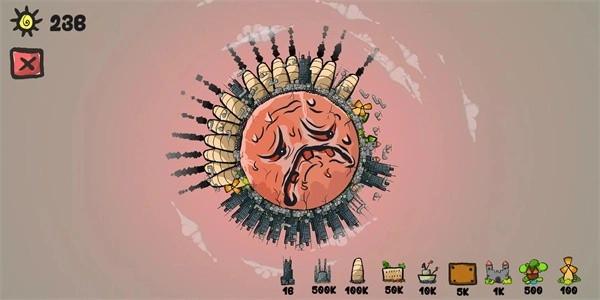 到了后期——由于此时地图上已布满各类资源建筑,人口数量也在持续增长,游戏的节奏开始明显加快。没过多久,曾经生机盎然的地球便褪去了色彩,变得灰褐而苍老,表面布满深深浅浅的沟壑,仿佛一张因痛苦而扭曲的脸,连象征生机的“牙齿”(植被、冰川等)都已所剩无几,尽显衰败之态。