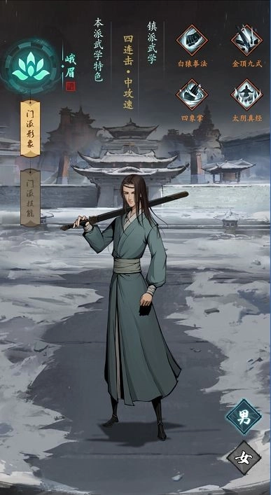 峨眉派坐落于地形险峻的峨眉山之中,山间常有群猴嬉戏、狼嚎回荡。相传其祖师曾于山中目睹猿猴相斗之景,由此获得灵感,不仅创编出峨眉通臂拳,更开创了峨眉一派,使其发展为如今的武林大门派之一。