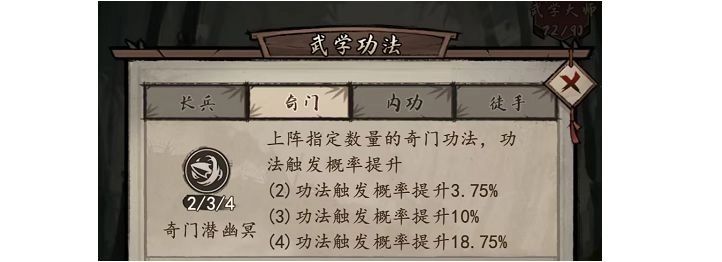 同时,依据携带的功法典籍数量差异,还会触发不同的加持效果。例如携带长兵类典籍时,当该类别典籍数量达到特定标准,就能额外增加伤害;而奇门类功法由于本身带有概率属性,相应的加持效果则是提升其功法触发概率。