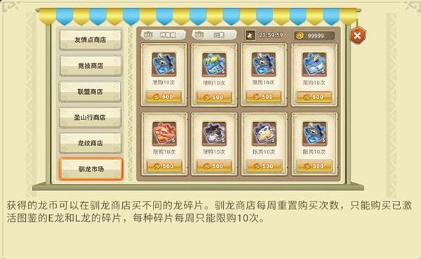 获得的龙币可以在驯龙商店购买不同的龙碎片。