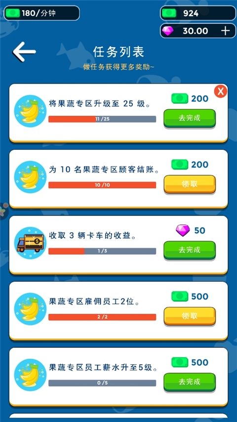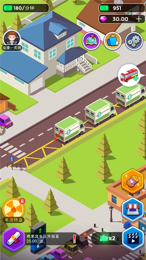 游戏初始阶段,玩家仅拥有一个售卖果蔬的区域和一名收银员,且收银效率十分低下,此时就需要玩家对相关设施或人员进行升级操作。