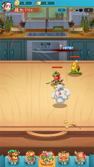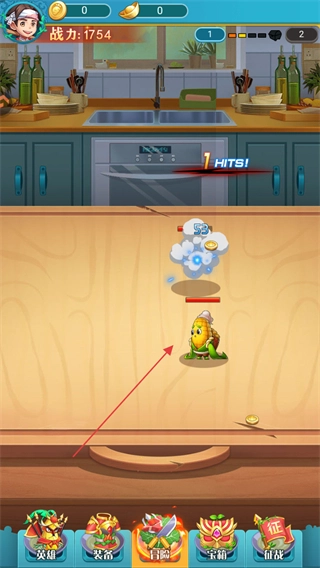 击败敌方精灵来获取金币与道具,以此持续提升英雄的战斗力,点击下方的“英雄”“装备”等按钮就能进行强化。
