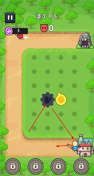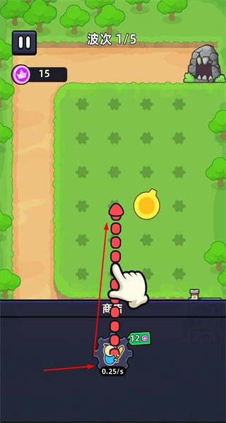 采用波次进攻模式,表示当前是第1波敌人,共5波,通过点击或拖动操作,在合适位置布置防御单位,阻挡从洞穴出来的敌人。