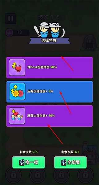 在特性选择界面,你可以挑选各类增益效果以强化防御能力,选定后在后续的战斗波次里就能获取相应加成,进而提高防御效率。