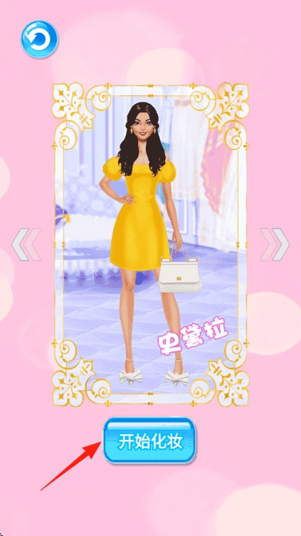 在角色选择界面,点击开始化妆,进入史黛拉化妆流程,粉色背景、金色相框展示角色,准备为其美妆、换装。