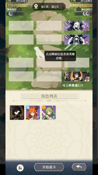 4、点击“战斗”,上阵最多五名角色进行推图挑战。