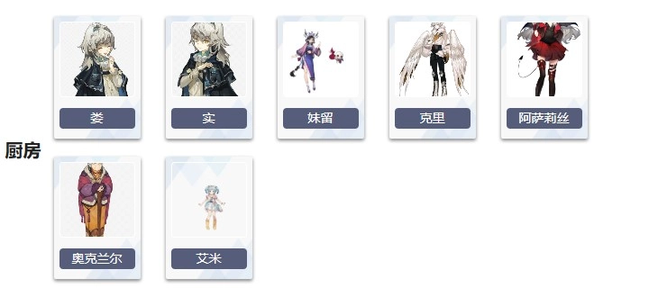 厨房:娄、实、妹留、克里、阿萨莉丝、奥克兰尔、艾米
