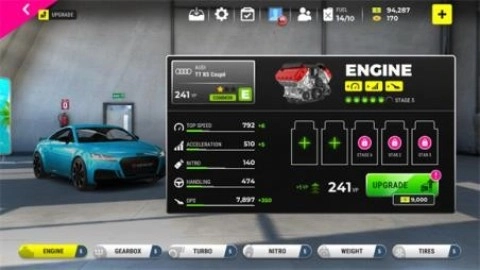 你能够对引擎、操控、速度以及轮胎等进行升级,而所有的升级操作都得耗费金币。