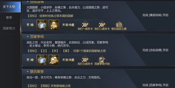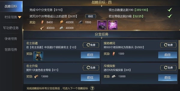 各位君主在不同等级阶段,如果暂时没有主线任务可做,就要主动去完成各项战略目标。把整套战略目标任务都完成后,能得到相应的经验和资源奖励。有些分支任务要求完成特定数量的分支任务才行,分支任务有多种类型,还可以消耗资源来刷新,而且刷新分支任务的价格会随着刷新次数不断上涨,每天24点会重置刷新相关的设置。