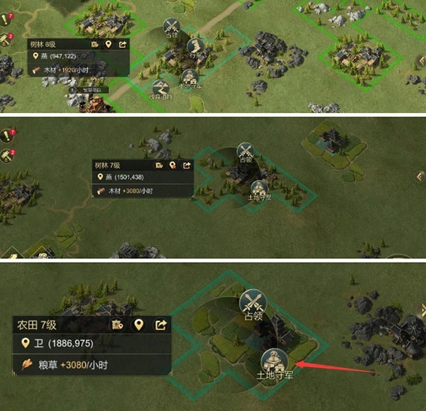 之后玩家需结合自身实力,或在有世族成员协助的情况下进行“翻地”操作。这里的“翻地”,指的是提升资源地等级——即放弃低等级资源地,转而占领当前实力可拿下的更高等级资源地。比如下方图中的例子:6级树林每小时产量为1920,而7级树林每小时产量达3080,资源产出有了显著提升。这也是当前大秦获取土地资源的主要方式。另外要记得,每天最好使用增产令道具,以确保自身资源产出能实现收益最大化。