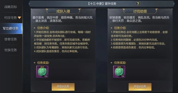 每个等级的军功爵任务都各对应两个,分别是【戎狄入侵】和【讨伐劫匪】。同一时间只能开启一个任务。完成这两个任务后,个人当前官爵会自动提升。当主城遭受攻击时,无法开启军功爵任务。
