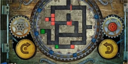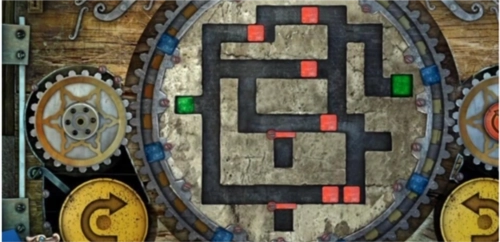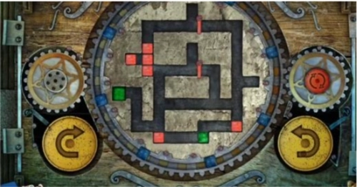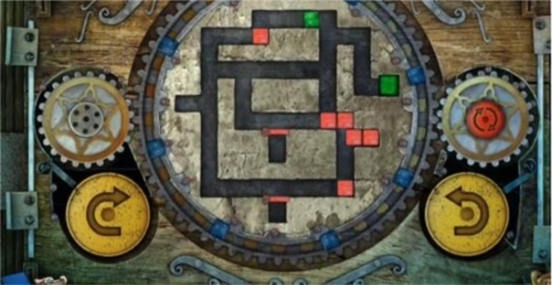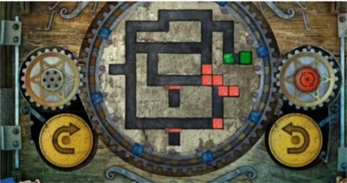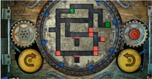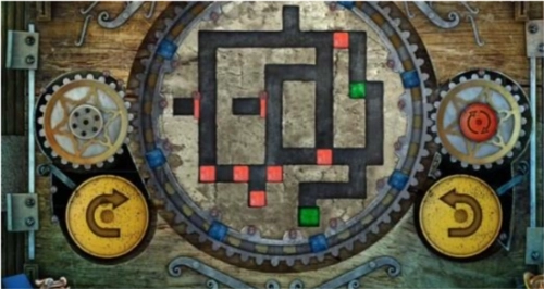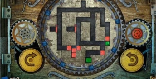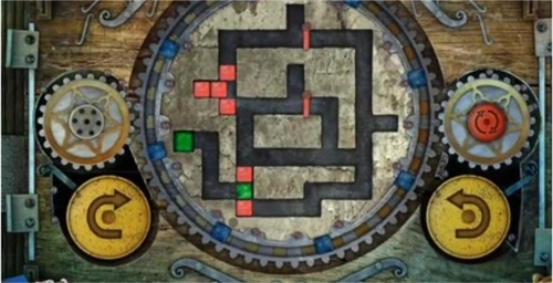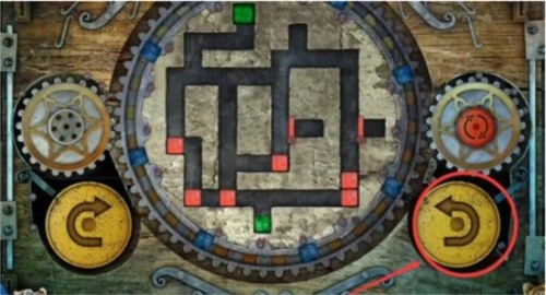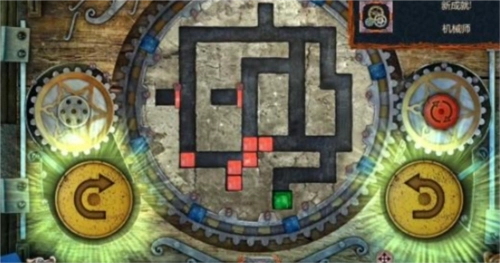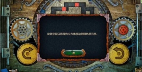 17、最后,点击左侧黄色的旋转按钮一次,中间的大齿轮会顺时针转动一回,转动后的立方体位置如图所示,此时绿色立方体已进入绿色单元格内,即可完成关卡,门便会开启。