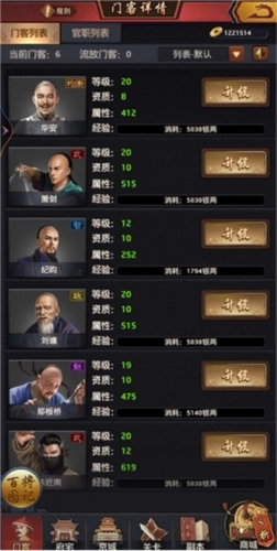 要培养门客的话,升级是必不可少的环节,哪怕门客资质技能再好,没有等级支撑也难以发挥作用。给门客升级会消耗大量银两,而且等级越高,所需银两就越多,因此若想培养新门客,得先准备好足够的银两才行。