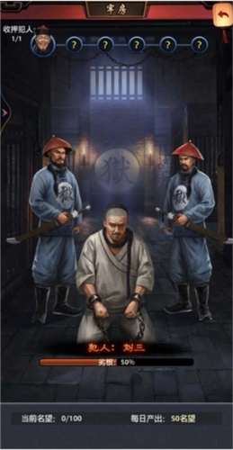抓获的犯人可在牢房内接受惩罚,每次操作消耗10点名望,能获取粮食、金钱、各类丹药、提升好感与颜值的道具、元宝、强化卷轴等奖励。不同犯人受罚后扣除的血量存在差异,需将当前犯人的血量打空,方可继续惩罚下一位。此外,每个犯人掉落的物品各不相同,排序越靠后的犯人,掉落的物品品质越优。名望会在每日凌晨依据个人的每日产出量(该产出量与通关数相关)进行增加,当日剩余的名望会予以保留,除非达到上限。