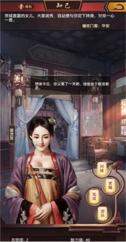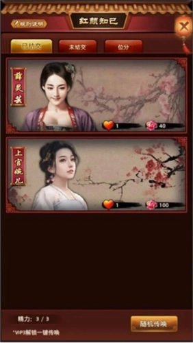 除了正妻之外,其他的红颜知己都需要通过寻访来随机触发相遇,多见面几次之后,红颜便会倾心于你并以身相许。