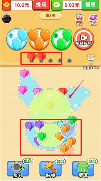 1、点击飞镖去击打相同颜色的气球,当打掉三个气球后,就能刷新出三个新的气球。