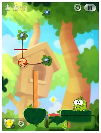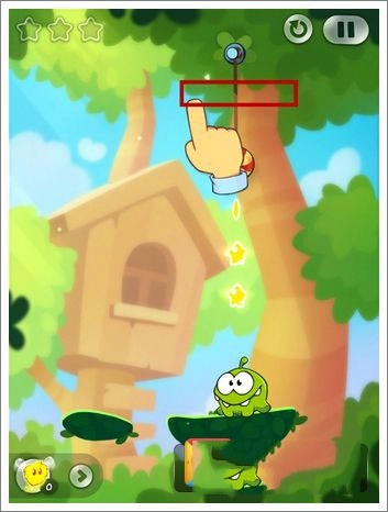 随着游戏的推进,难度不断上升,到了第四关时,我们首先需要切断上方的绳子,以此来获取前两颗星星。