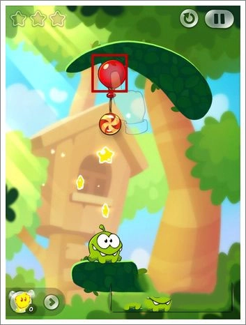 4、戳破右侧的气球,借助力的作用让糖果摆动到左边,从而吃到最后一颗星星。