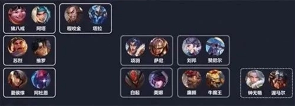 猪八戒-阿塔程咬金-塔拉刘邦-赞尼尔苏烈-维罗项羽-萨尼廉颇-牛魔王夏侯惇-阿杜恩白起-美娜钟无艳-渥马尔