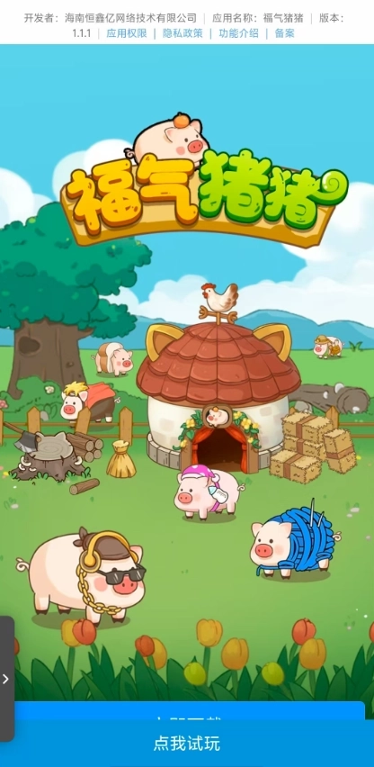 福气猪猪游戏是海南恒鑫亿网络技术有限公司于2025年全新推出的一款通过猪猪合成升级赚取零花的手机小游戏。在游戏里,你只需轻松点击相同的猪猪进行合成升级,就能收获丰厚的惊喜奖励。而且猪猪合成的等级越高,对应的福利也会更加丰厚,十分值得大家去尝试体验一番!