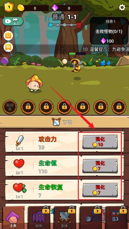 点击下方属性,可以通过升级提高战斗力