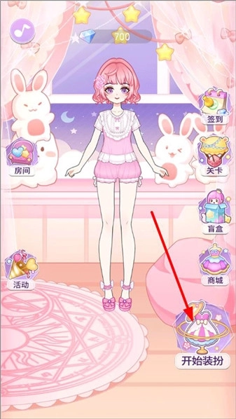 1、打开装扮魔法少女,进入游戏主场景,玩家可以打开房间、签到、通关、逛商场等,点击开始装扮;